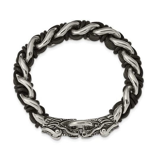 White Stainless Steel Dragon Bracelet wtih Leather Accent