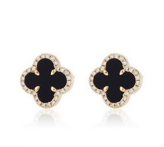 Yellow 14 Karat Clover Earring With 2=1.95Tw Fantasy Cut Onyxs And 0.23Tw Round Diamonds