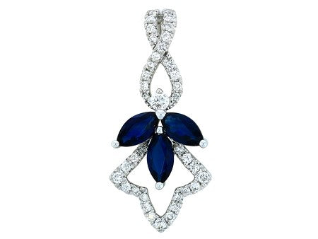 Beautify any ensemble with this stunningly elegant gemstone pendant. Expertly crafted with a floral inspired design featuring a bow of marquise blue sapphires and a ribbon of brilliant diamonds, this eye-catching pendant is sure to make a stunning statement.