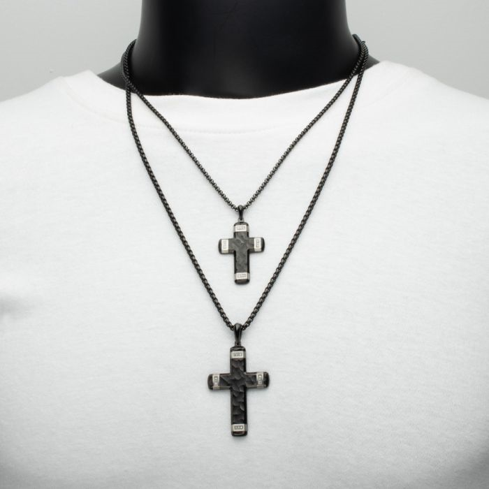 Two Tone Black And White Stainless Steel Matte' Cross Necklace Length 24 12 Round Lab Grown Diamond Accents