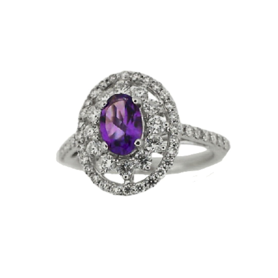 Bring a pop of color to your jewelry collection with this stunning amethyst ring. Crafted from shining 14 karat white gold, this ring features a beautiful 0.44 carat oval amethyst and a sparkling 0.50 carats in round G color Si2 clarity diamonds in a halo setting. Perfect for any occasion, this ring is a must-have for any jewelry lover.
